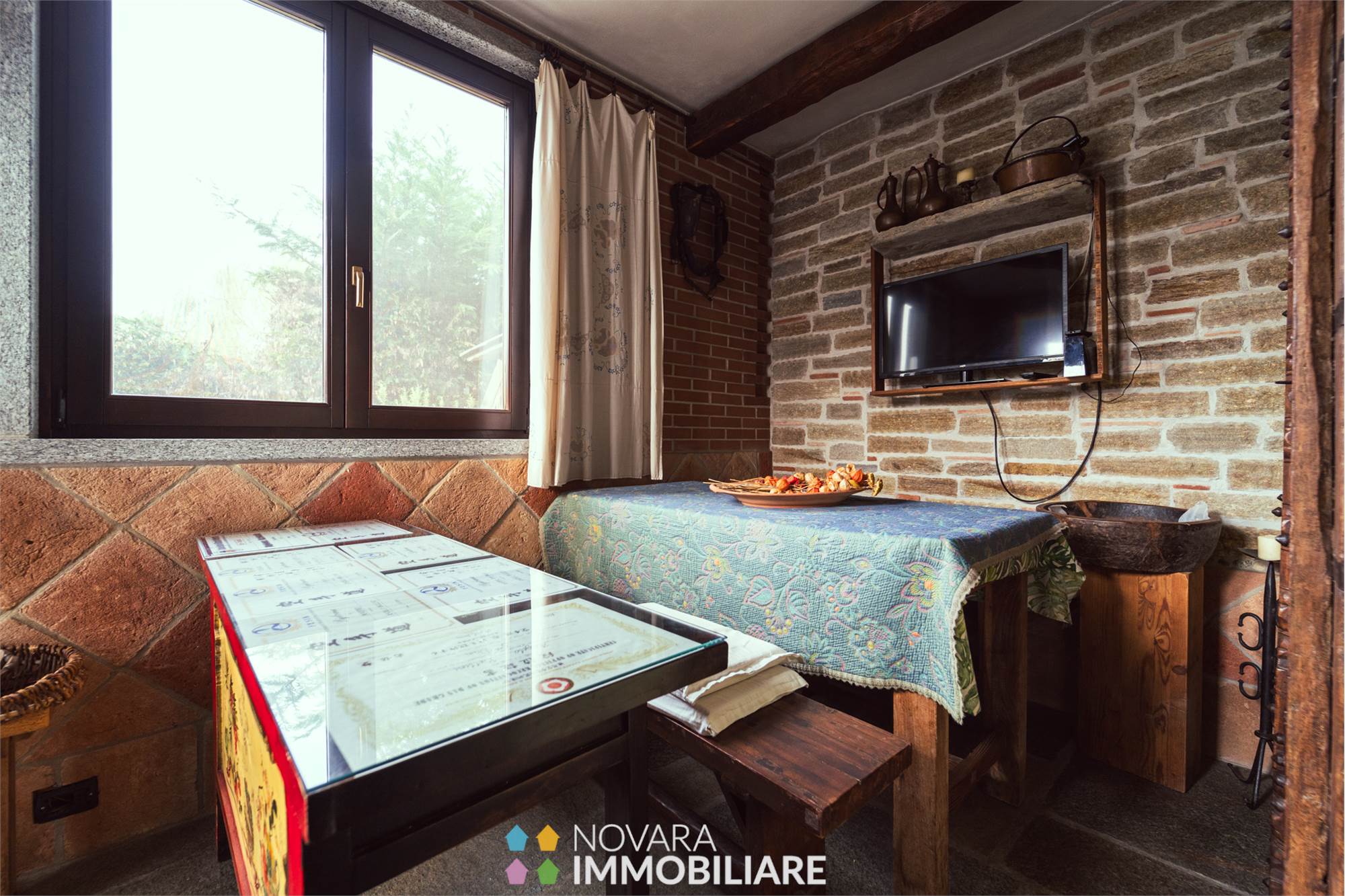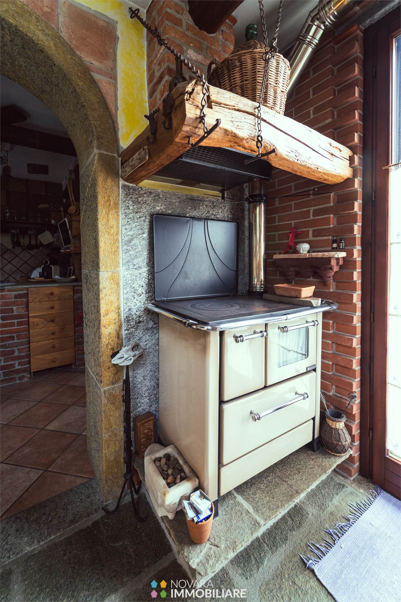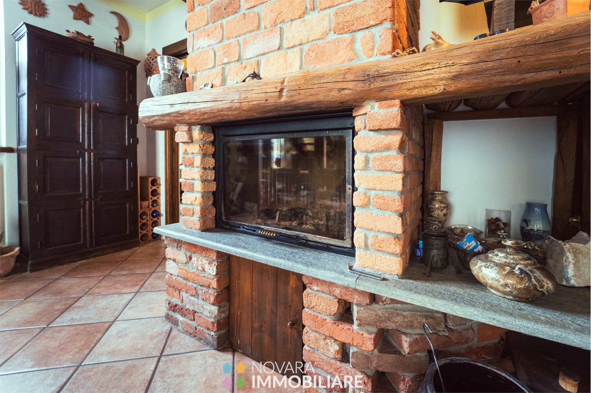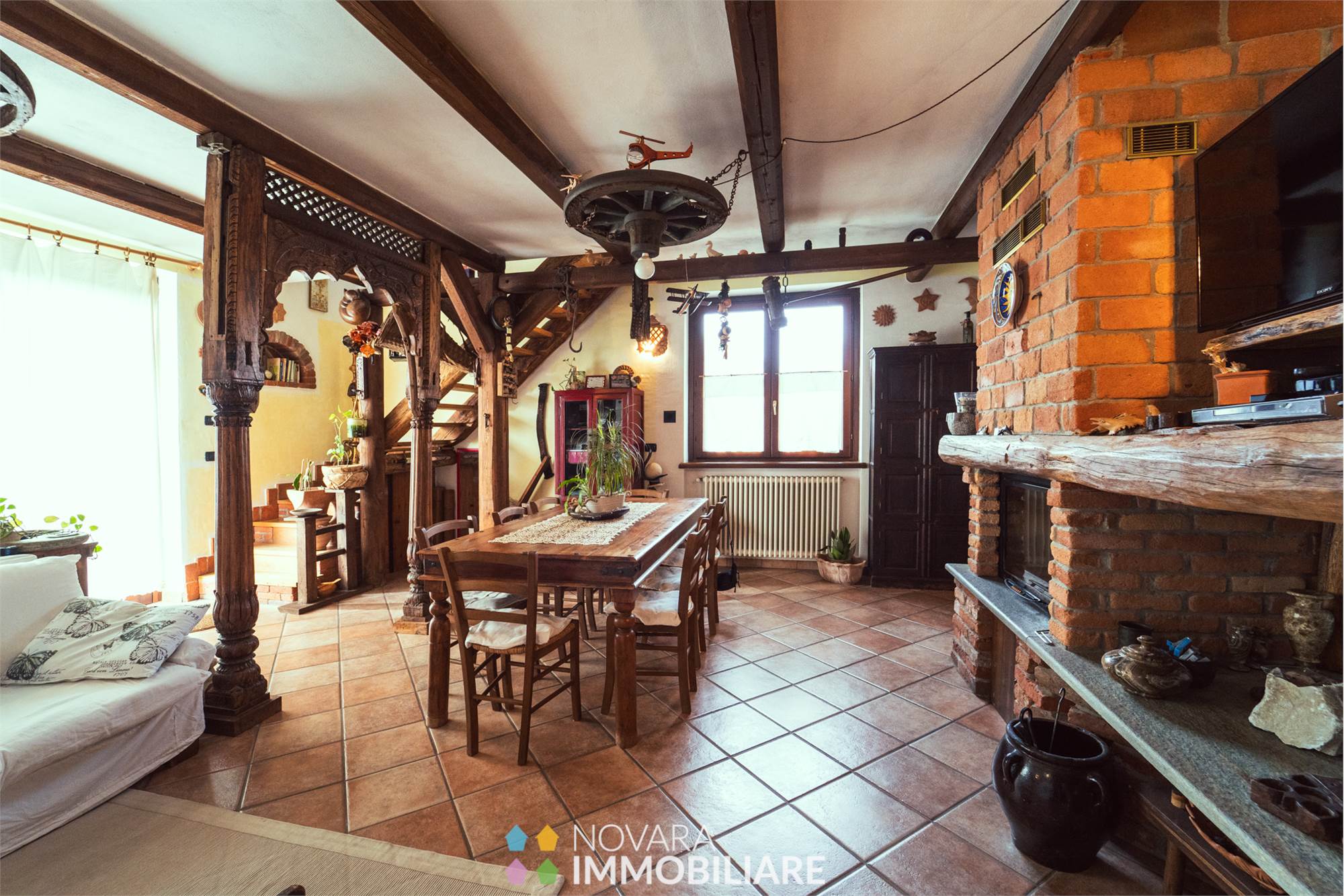 Al piano terra la zona giorno composta da un affascinante open space con camino e affaccio sul giardino, sala da pranzo con mattoni a vista, cucina abitabile in muratura molto caratteristica con ingresso anche dal porticato e bagno in pietra.