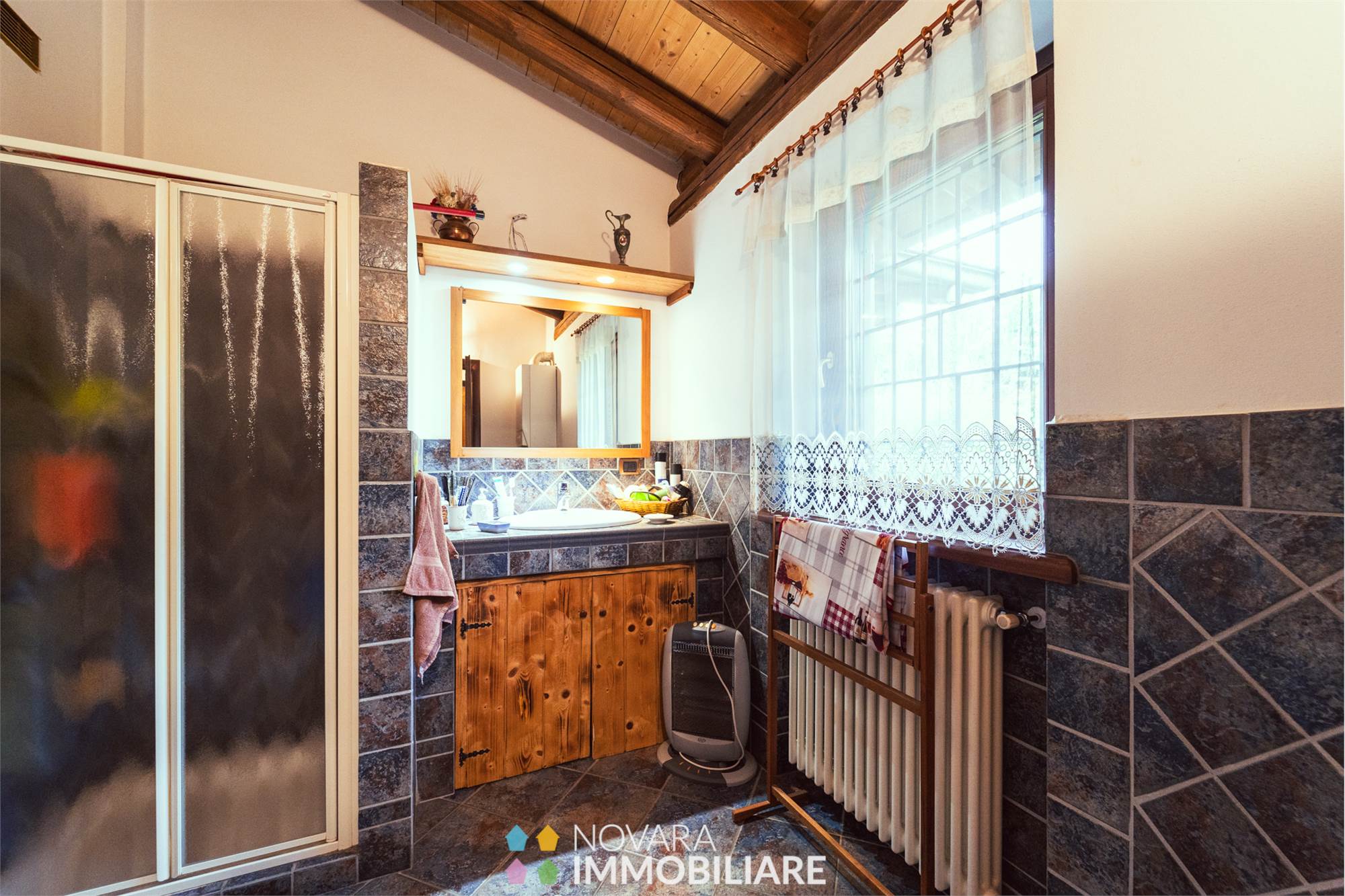 Al piano superiore una camera matrimoniale mansardata con travi a vista, cameretta con ampio disimpegno, balcone e bagno.